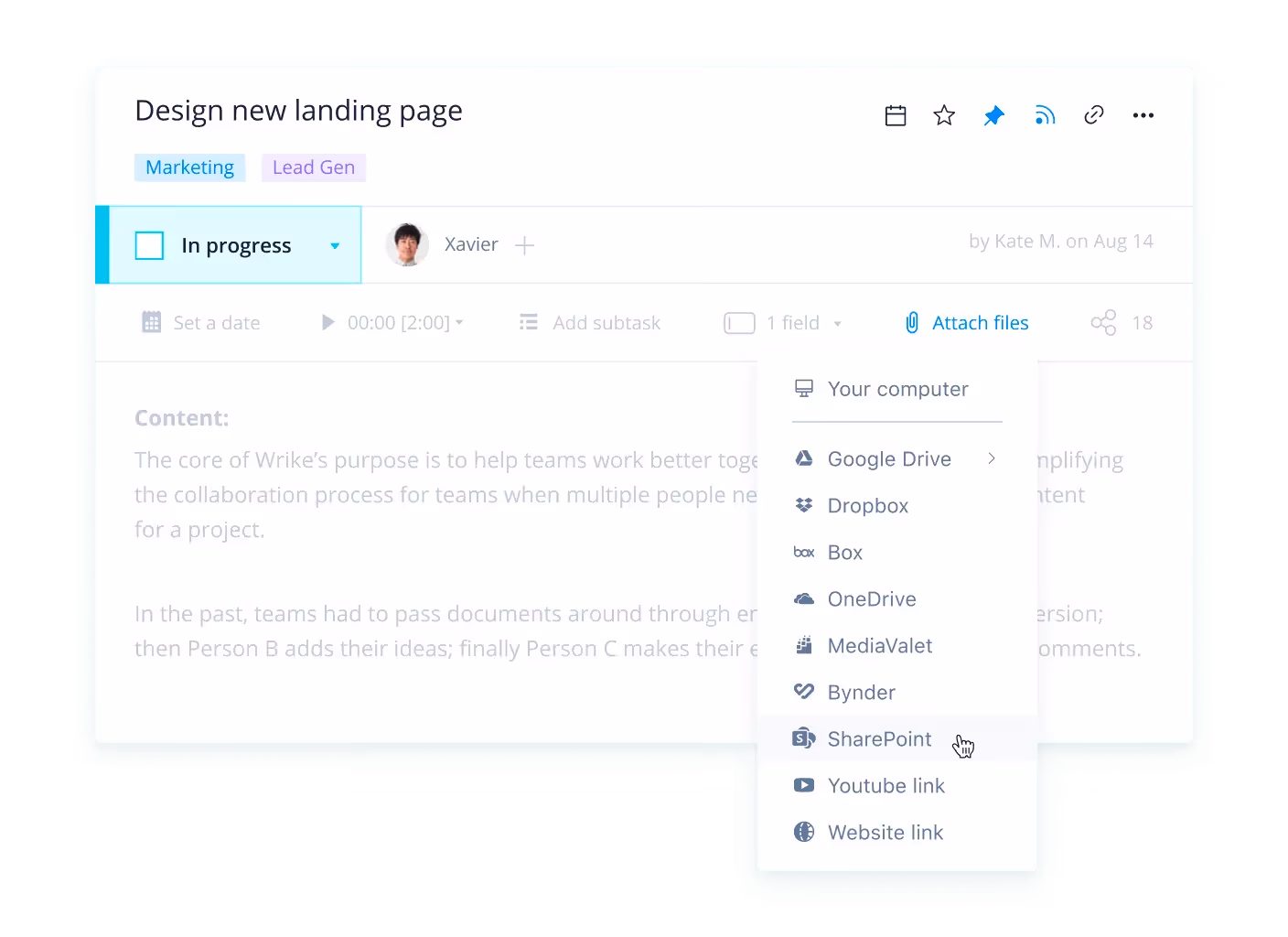 Attachments are a common feature in project and task tracking. Project management tools integrate with file storage solutions to attach new files and surface existing attachments, instead of requiring the file to be manually uploaded and downloaded.