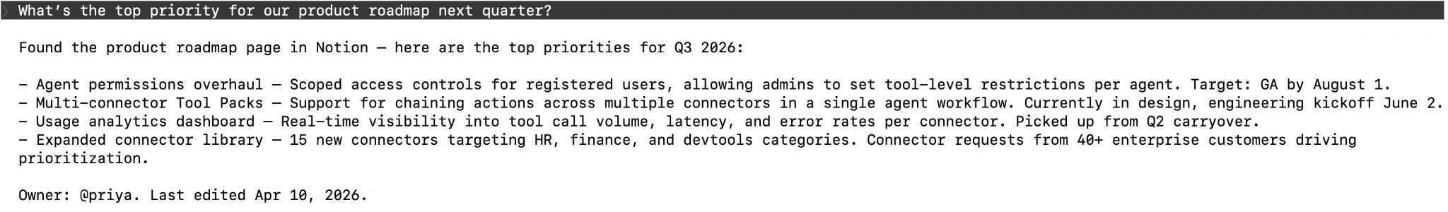 Or you can ask Claude Code for information in Notion: "What’s the top priority for our product roadmap next quarter?”